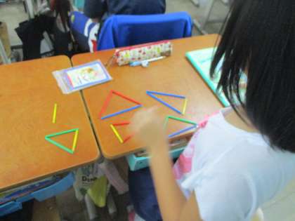 実際に棒を使って三角形をつくる活動はとても楽しかったようです。