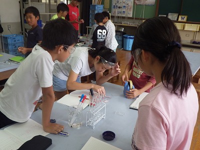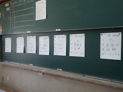 それぞれの水溶液の特徴を考えながら,リトマス紙を使ったり蒸発させたりしながら「正体不明の4種類の水溶液」を調べました。実験の順序や方法をグループで相談し合い,水溶液の正体に迫りました。