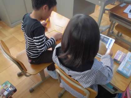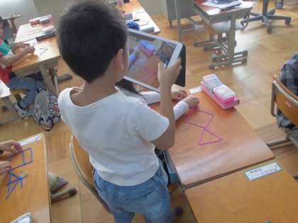 タブレットを使って,できた形を写真にとり,みんなでそれぞれが作った形を確認しました。