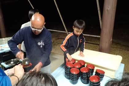 夕飯の配膳の時。味噌汁を入れる教員の横で,先生が取りやすいように椀を並べる男の子。