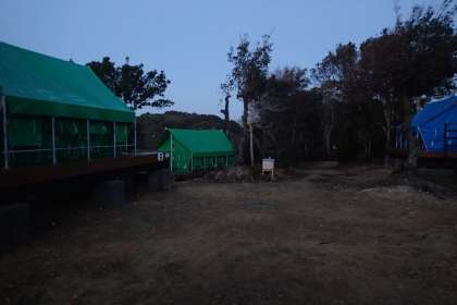 下は5時40分ごろのテントサイト。このテントの中で,2組の子どもたちが寝ています。(じっさいは,けっこう目覚めてました!)