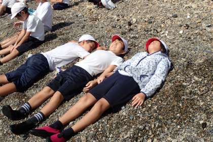 下は,濡れた服を乾かす子どもたち。