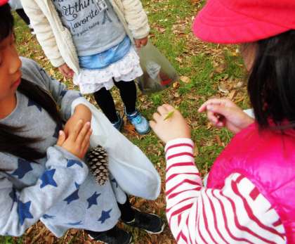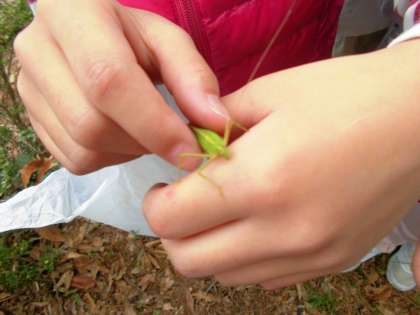 秋みつけで見つけたのは、植物だけではありません。枯葉の間に隠れていた、キリギリスも見つけました!