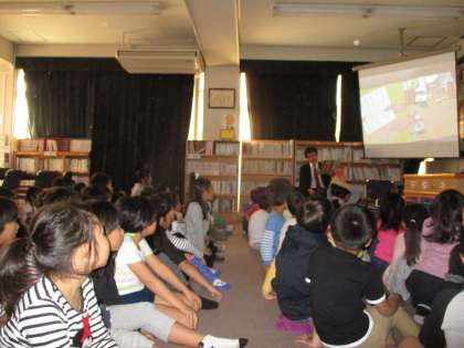 今日の図書室利用の時間に校長先生に,絵本の読み聞かせをしていただきました。
