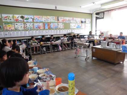 給食のデザートの「かき」の英語を教えてもらったりジェスチャーでコミュニケーションをとったりと楽しい時間になりました。