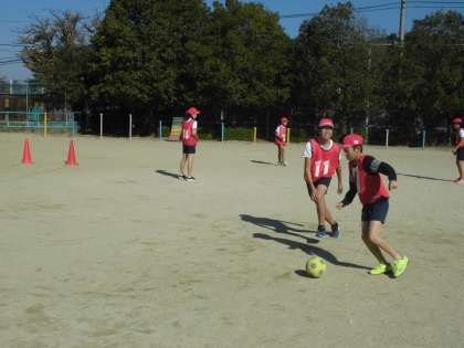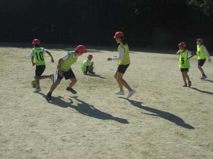 授業では久しぶりのサッカーです。ボールはスポンジのボールなので,苦手な子も積極的に参加して,楽しい試合になっています。