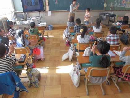 正しい持ち方を確認した後には,30秒でお豆を何個うつせるかチャレンジしました。