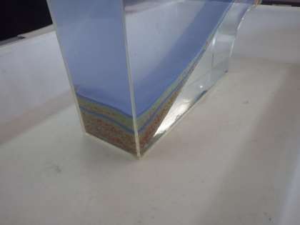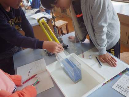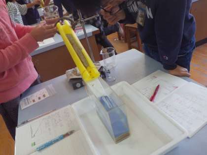 今日は「カラーサンド」という砂を使って,地層のでき方を調べました。水で流し込むと大きな茶色い粒が先に沈み,細かい青い粒が後から沈んでいく様子が観察できました。その後,長い年月の間,押し固められた「礫岩,砂岩,泥岩」を観察しました。