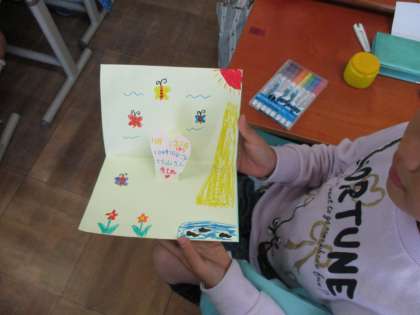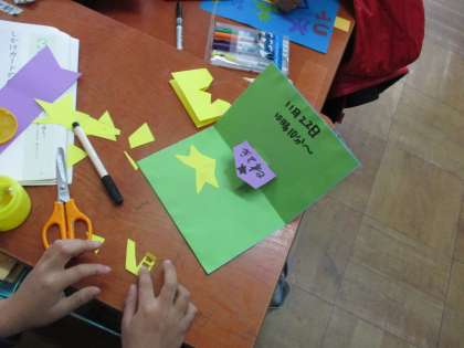 22日(木)の学習発表会の招待状を楽しそうに作っていました。