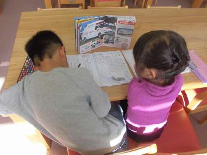 じどう車くらべの授業の中で,ペアでお気に入りの車の図鑑を作っています。