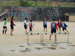 昨夜からの雨で、朝は運動場が使えませんでした。6年生は何とか乾いてきた運動場で、水たまりをよけてサッカーの学習です。
