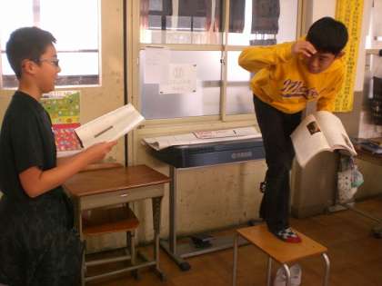 2学期の末に,国語科で狂言の学習をしました。子どもたちから,「実際に演じてみたい。」という声が出てきたので,ペアでアド(柿主)とシテ(山伏)に分かれ,発表会をしました。