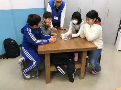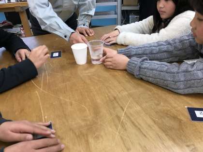 発泡スチロールのコップとプラスチックのコップに入ったお湯を持ち比べてみて高い断熱性を実感することができたようでした。
