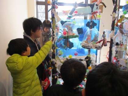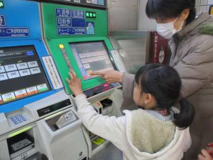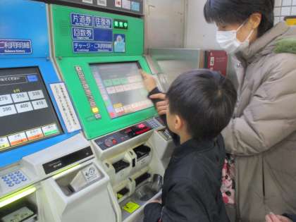 御池ギャラリーまで小さな巨匠展の見学に行きました。電車では切符を買う練習をしました。お金を必要な枚数入れて,正しい切符を買うことができました。巨匠展では自分のつくった宇宙人を見つけ,「飛んでる!」ととても喜んでいました。卒業した先輩や,他の学校のお友達とも会えて,嬉しそうでした。