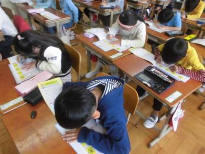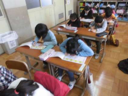 ひとりひとり集中して漢字に取り組んでいます。一画ずつよく見て丁寧に書いています。漢字で気をつけなければならない場所を確かめて書いていました!