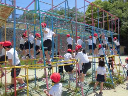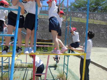 体育で,総合遊具の使い方を学習しました。安全に気を付けて,みんなで楽しく遊具を使うことができました。はじめは「二階まであがるのがこわい!」と言っていた子も,勇気を出してチャレンジしていて偉かったです。