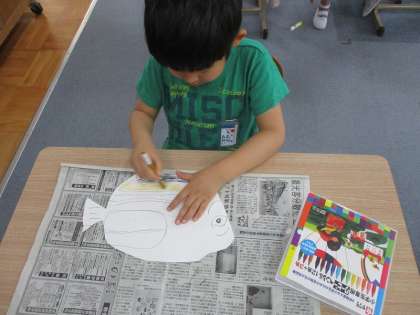 生活単元学習では「魚つりゲーム」をするため,「おしゃれな魚や海の生きもの」を作っています。カラフルな魚や,おもしろい形の生きものなどたくさんできてきました。