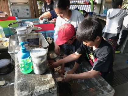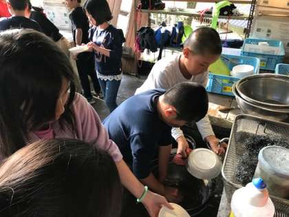 真っ黒になったお鍋をゴシゴシ!協力して片付けを進めています。