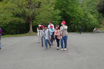 山の家への長い坂道を上ってくる子どもたち。