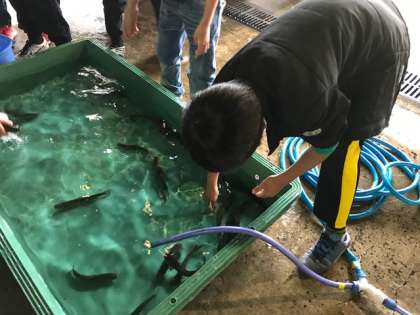 あいにくのお天気。雨は降っていませんが気温が低く魚つかみは炊事場で行うことになりました。