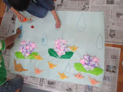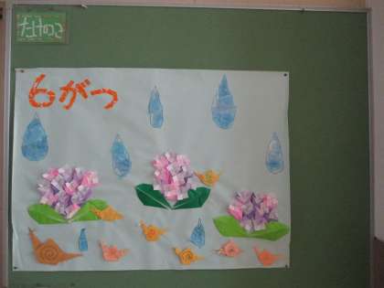 たけのこ学級前の廊下の壁面に貼るかざりを製作しました。折り紙であじさいやかたつむりなどを作り,しずくはスズランテープを切ってはりました。もうすぐ梅雨に入りますね。