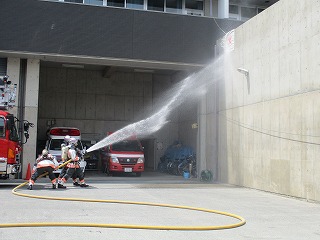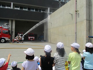 消防車についているホースから放水しているところまで見ることができ,子ども達は大興奮でした。