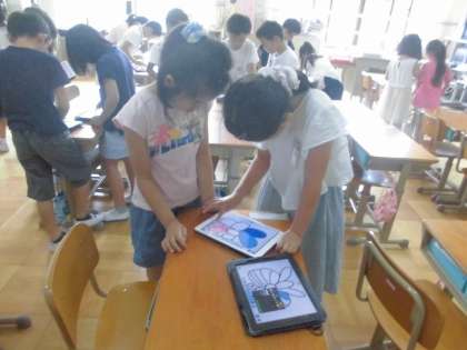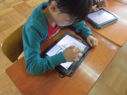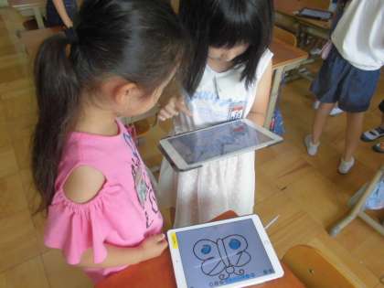 英語でオリジナルちょうちょづくりをしました。タブレットでちょうの絵を描き,友達に塗ってほしい色を伝えてカラフルなちょうちょができました!「orange please!」と昨日覚えた色の名前を思い出して伝えていました!
