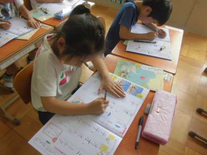 書写でカタカナの練習をしました。とめ・はね・はらいに気をつけて,一画ずつ丁寧に書いていました!納得いかない字は,納得がいくまで何度も書き直していました。とても集中して取り組むことができました。