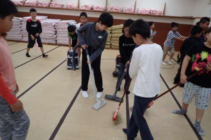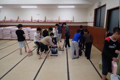 りっぱです。6時起床で,6時15分にはご覧のとおり掃除まで始める男子。