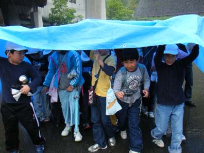 午後はプレイホールでゲーム。雨の中,プレイホールまでの道をブルーシートをかぶって行きました。ちょっとしたお楽しみでした。