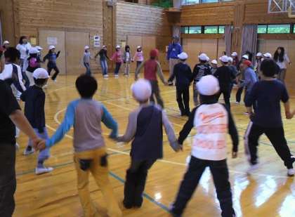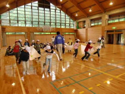 プレイホールでは,山の家の「ドッティ」先生にいろいろなゲームをおしえていただき,頭や体を動かしたり,グループで協力したりしながら楽しい時間を過ごしました。初めてのおもしろいゲームばかりで、学校に帰ってからでもやってみたいと思います。「ドッティ」先生,ありがとうございました。