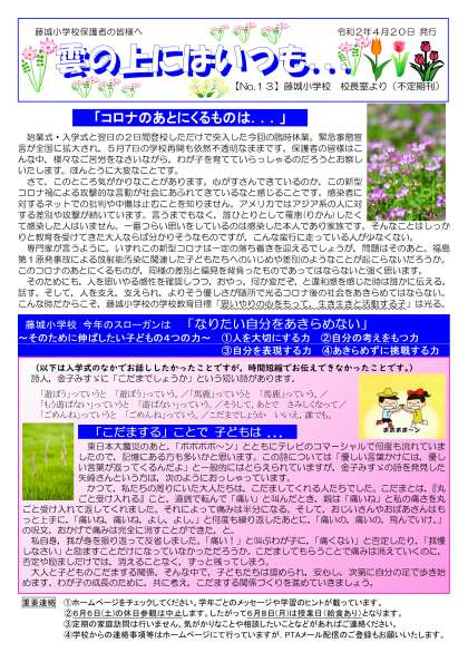 来週,ご家庭にポストインする(特例預かりの児童には学校で配布)プリントの中に,下の「雲の上にはいつも...」No.13を入れさせていただきました。御一読ください。(発行は4月20日付けとなってます)「雲の上にはいつも...」No.13