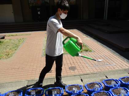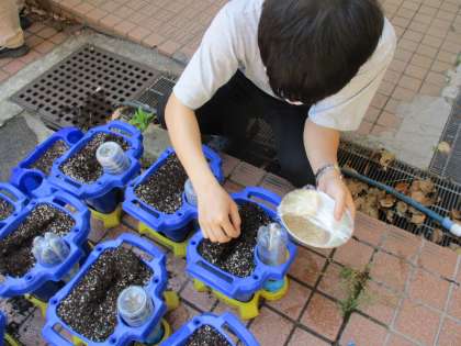 きょうは,みんなの うえ木ばちに トマトの たねを まきました。
