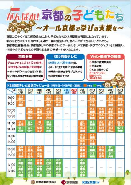 今回は1年生から6年生までの,すべての学年が対象になっています。ぜひ,ご活用ください。放送スケジュールはこちら→KBS京都 放送スケジュール(5月18日〜29日)