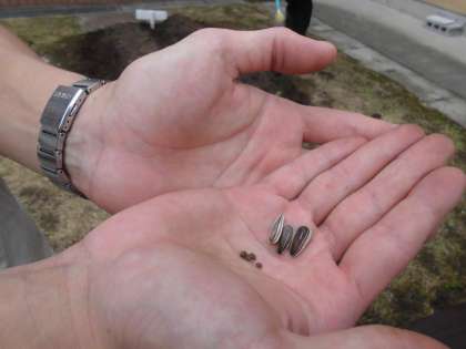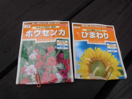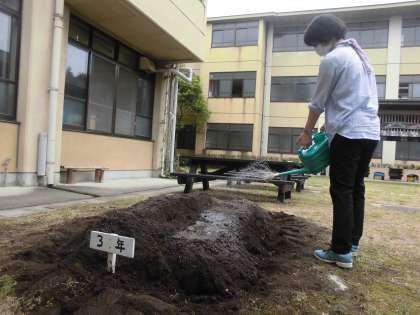 ひりょうをまぜた土にヒマワリとホウセンカのたねをまきました。