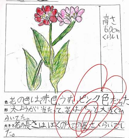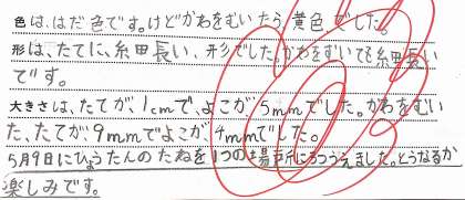かんさつカードのかだいでとても上手にかんさつして絵や言葉をかいている人がいるのでしょうかいします。
