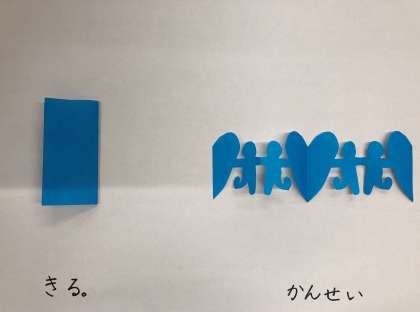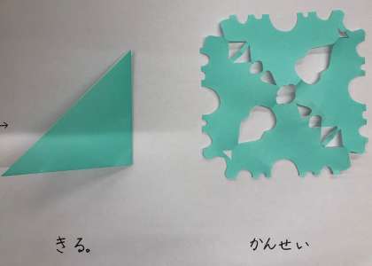 きょうは,おりがみを さんかくに おった かたちを きって つくって みましょう。ながしかくの おりがみを おって きる つくりかたも あります。