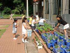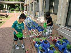 代休明けの火曜日、元気に登校した子どもたちは、さっそく中庭で水やりに取り組んでいます。低学年のアサガオやミニトマト、中学年はツルレイシ(ゴーヤ)に2日分の水やりをしました。