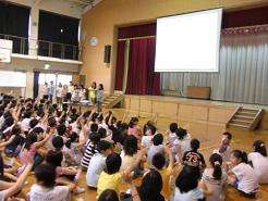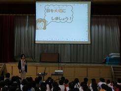 14日の朝会は、まず保健集会です、保健委員が制作した「視力が下がるのをふせぎましょう。」のプレゼンを見ながら、クイズに取り組みました。