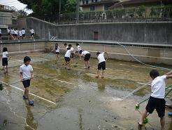 いよいよ水泳学習の季節がやってきます。今日は高学年がプールを掃除しました。1年間たまった泥や木の葉をきれいに取り除いて、来週から低学年が低い水位で水慣れにプールを使います。