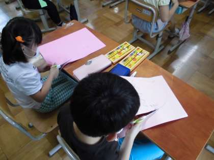 2年生は,今年度初めての交流授業でした。昨年とは教室の場所も変わり,ちょっぴりドキドキしている様子でしたが,久々に学年のお友達と会えて嬉しかったようです。好きな色の画用紙に大きなたまごの形をかいて,思い思いの模様をつけました。