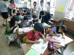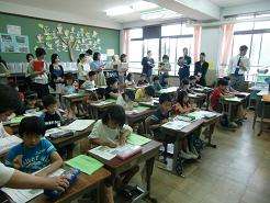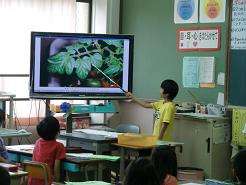 情報教育の第1回目の授業研究会を2年の国語科で行いました。「ミニトマトのかんさつきろく文を書こう」の単元名で「詳しく観察し集めた情報を活用しやすいように整理して観察記録文を書く」ことを「ねらい」として取り組みました。本時はアップとルーズで撮った写真を見比べて書くときに大切なことを見つけました。デジタルカメラや大型テレビを活用して子どもたちは活発に交流することができました。