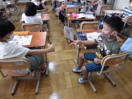 「さんぽ」と「じゃんけんぽん」の歌に合わせて手拍子や足踏みをして,楽しく拍を感じました。