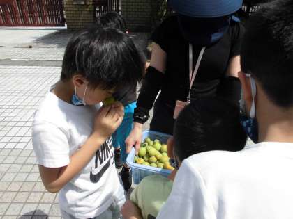 朝マラソンに出かける途中で,昇降口前にある梅の木からとれた実を見せてもらいました。どれも大ぶりで,とってもいい香りがしました。