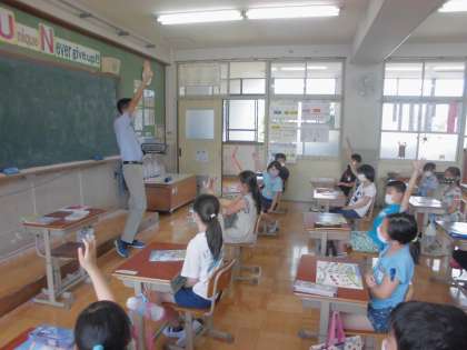 ALTのアリオーラ先生と一緒に世界の挨拶と自己紹介の仕方を学びました。