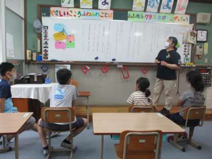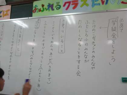 高学年チームで「藤城小のみんなが楽しくなることをする会をひらこう」というお題で学級会をしました。1年生から6年生のみんなと仲良くなるために,どんなことをしたいかとどんな名前の会にしたいかを考えました。「うーん…」と悩みながらも4人で意見を出し合って話し合うことができていました。