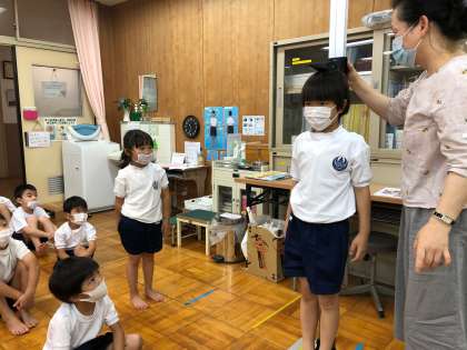 保健室での並び方や待ち方などを学習してから,マスクの使い方について西川先生から教えていただきました。