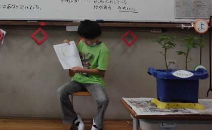 たけのこで育てているトマトが元気に育っています。「いろ」「かたち」「大きさ」「においや手ざわり」などに注目して観察し,観察カードに書いた内容を発表しました。よく見ると葉っぱに虫食いの小さな穴があるよ!と細かいところまで気付いている人もいました。
