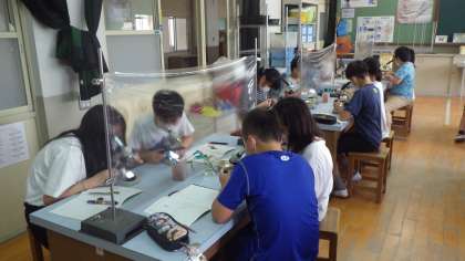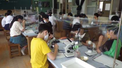 コロナ対策で今までのような観察や実験がなかなかできない状況ですが,今日は顕微鏡を使って「ツユクサ」の葉を観察しました。対面の座席になるので,ビニルシートでガードを設置しての学習です。顕微鏡の使い方を振り返った後,ツユクサの葉を薄く裂いて観察しました。すると葉から水蒸気が出ていく小さな穴「気孔」が見つかりました。意外な形に驚きの声をあげていました。