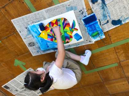 今日は,ローラーを使って,海を描いていきました。
